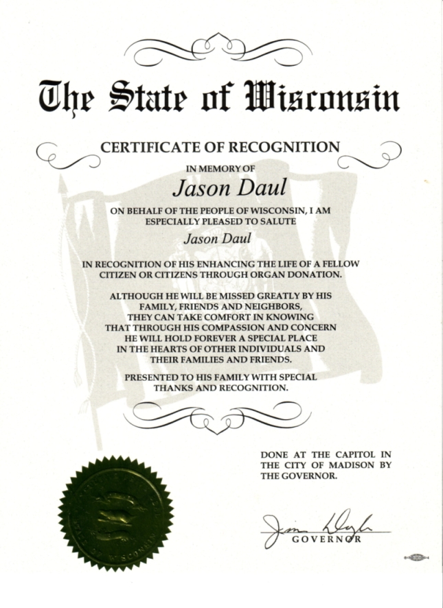 The certificate received by the governor regarding Jason's gift of life to others.