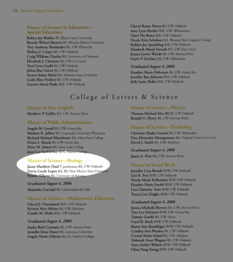 The page showing Jason's Master of Science awarded to him by the University of Wisconsin - Oshkosh.